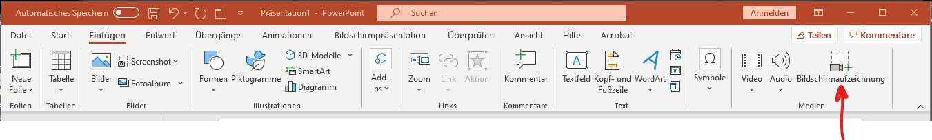 Erklärvideos lassen sich schnell und unkompliziert auf folgende Weise erstellen: Wichtiger Hinweis: Es geht hier NICHT darum, dass Sie jetzt mit Powerpoint weiterarbeiten müssen! Sie können auf diese Weise alle möglichen Aktivitäten auf Ihrem Bildschirm abfilmen! Öffnen Sie beliebige Fenster und Softwareprodukte...wenn Sie es auf Ihrem Bildschirm sehen, können Sie es abfilmen. Powerpoint ist sozusagen nur die "Filmsoftware".