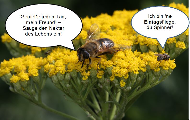 Sprech- oder Gedankenblasen entsprechend Jetzt müssen Sie nur noch Sprechblasen oder Gedankenblasen zu den Bildern hinzufügen. Dazu müssen Sie lediglich im gleichen Menüpunkt <Einfügen> auf das Untermenü <Formen> klicken. Am unteren Ende dieses Kontextmenüs finden Sie dann die entsprechenden Symbole. Die Startpunkte der Sprech- oder Gedankenblasen sind jeweils dicke gelbe Punkte; diese können Sie per Mausklick ganz einfach auf die jeweils sprechenden/denkende Person richten. Das Beispiel unten entstand vor einigen