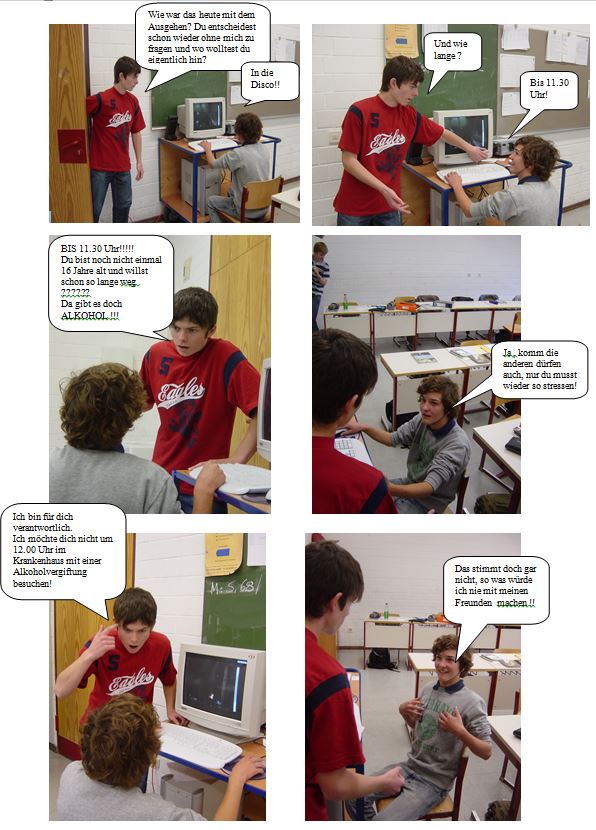SprechblasengeschichtenMit Hilfe der Textverarbeitungssoftware WORD und digitalen Schülerfotos lassen sich leicht kreative Bildergeschichten oder zum Beispiel auch ganze Fotoromane gestalten. Die Schüler denken sich eine Handlung aus (oder übernehmen die
